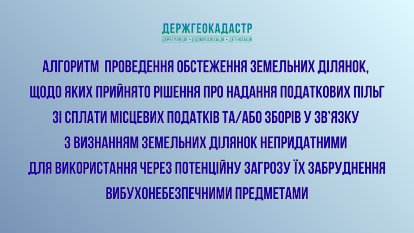 Держгеокадастр розробив алгоритм проведення обстеження земельних ділянок, щодо яких прийнято рішення про надання податкових пільг зі сплати місцевих податків та/або зборів у зв’язку з визнанням земельних ділянок непридатними для використання через потенційну загрозу їх забруднення вибухонебезпечними предметами, відповідно до постанови КМУ від 20.08.2025 №1009.
