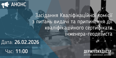 Повідомлення про проведення засідання Кваліфікаційної комісії з питань видачі та припинення дії кваліфікаційного сертифіката інженера-геодезиста 26 лютого 2026 року